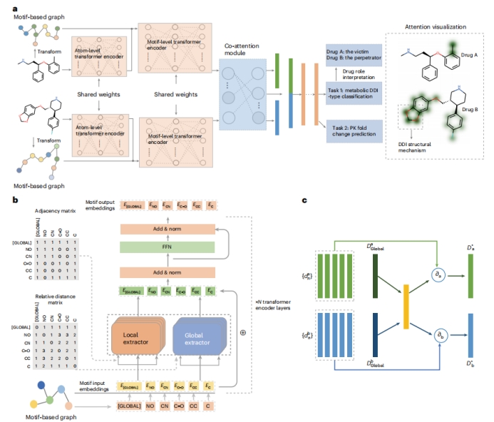 因此,本文以代谢相互作用的生物学机制为基础结合人工智能构建了一个名为MeTDDI的深度学习模型。该模型将药物分子拆分为具有化学意义的基团,并将其构建为模体(motif)图, 然后引入一个基于Transformer的架构来识别药物分子内基团的相互作用来表征药物结构,并利用联合注意力机制识别药物间的相互作用。在第一个预测任务上,该研究将导致代谢相互作用的药物称为作恶者,其联用药物作为受害者,同时假设在肝脏中作恶者药物先于受害者结合代谢酶来导致药物相互作用,以此构建了具有生物学意义的标签,使模型能够高效识别药物中的作恶者和受害者,同时为代谢相互作用机制的解释提供明确的语义。在另一个预测任务上,该研究关注由于代谢相互作用引起药物血药浓度变化的预测,从文献和药物标签中收集了基于临床实验的结果。MeTDDI 在两个预测任务都取得先进的预测性能,为高通量准确地预测药物相互作用提供支持。