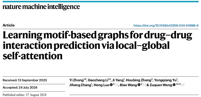 药物不良反应预测一直是药物研究领域的难题和痛点。2024年8月27日,福州大学翁祖铨教授团队,联合福建医科大学附属第一医院王彪教授团队和MetaNovas Biotech Inc.的罗衡博士,在国际顶级期刊《Nature Machine Intelligence》在线发表了题为“Learning motif-based graphs for drug–drug interaction prediction via local–global self-attention”的研究论文,通过医工结合新型的交叉研究模式为解决药物相互作用预测提供了新的思路和方法。在我校积极提倡医工交叉融合研究的大背景下,首次通过生物科学与工程学院和计算机与大数据学院联合攻关取得的标志性成果。福州大学计算机与大数据学院(软件学院)博士研究生钟意和李杲正为本研究的第一作者和共同第一作者。