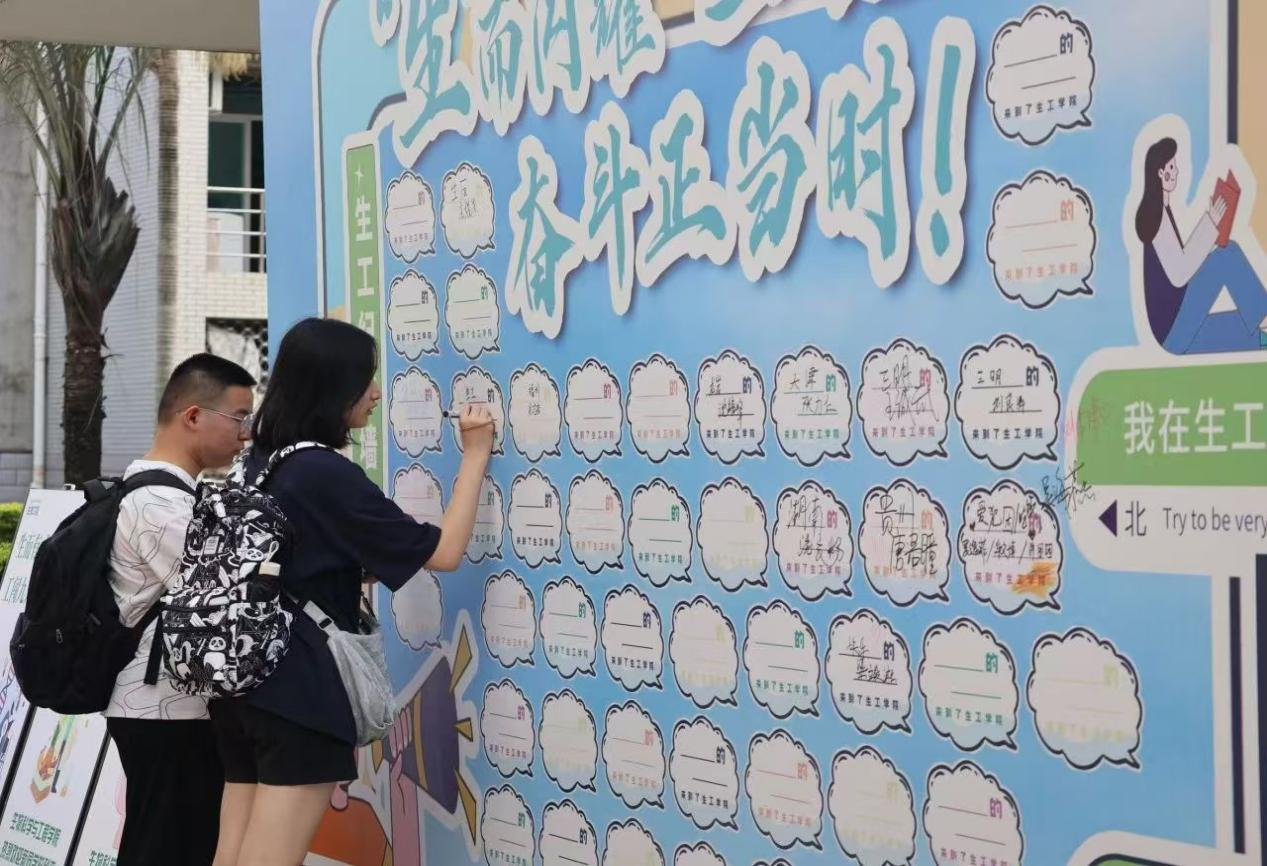 在铜盘校区3号楼门口打卡点,志愿者热情欢迎,为新生递上笔,给新生与家长提供合照帮助,让新生在纪念墙留下专属印记与独家记忆。那一张张青涩而充满朝气的脸庞,满眼是无限的活力。他们带着对未来的无限憧憬踏上这片土地,这片土地也将见证他们从初露锋芒到光芒万丈。