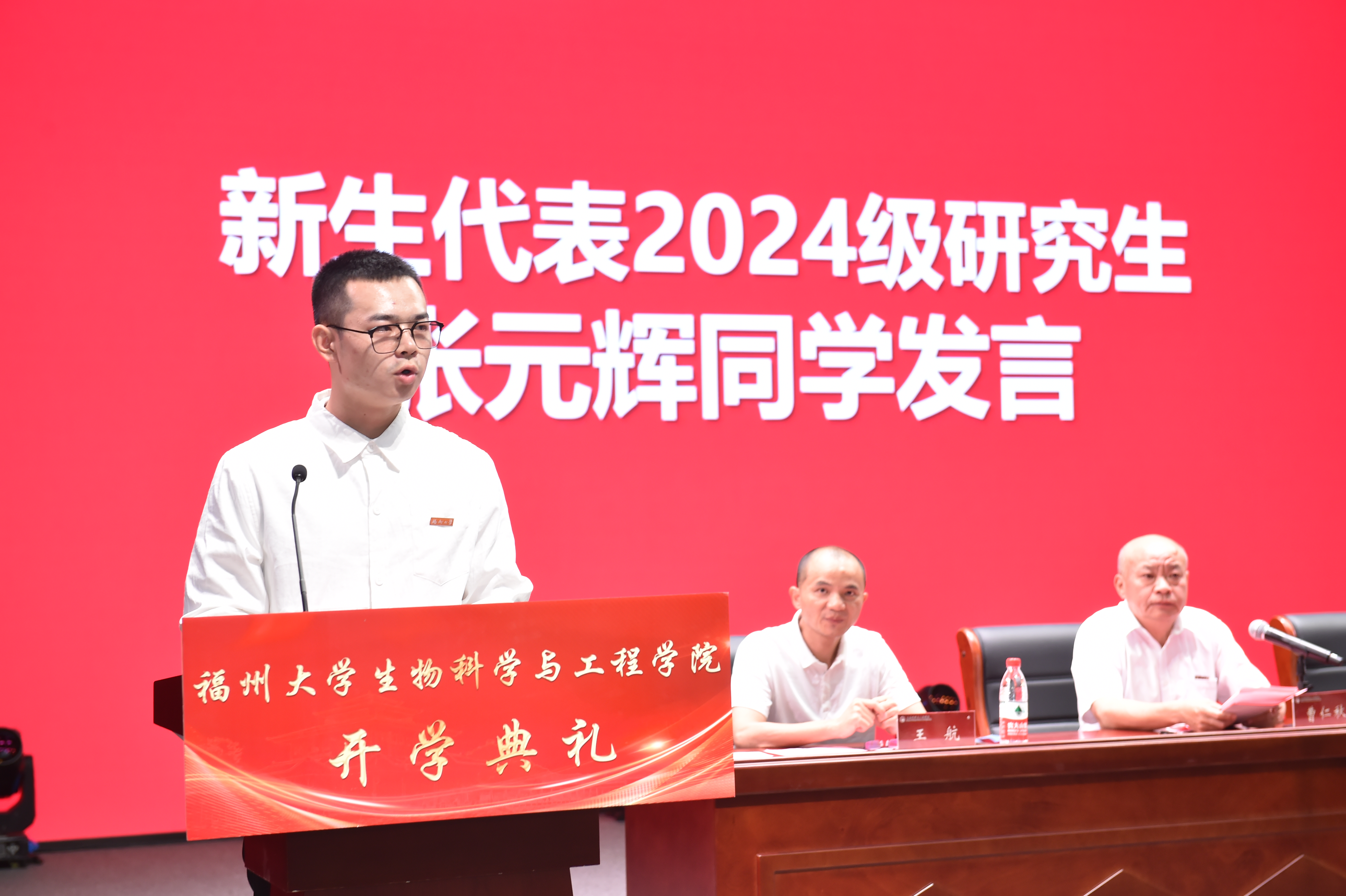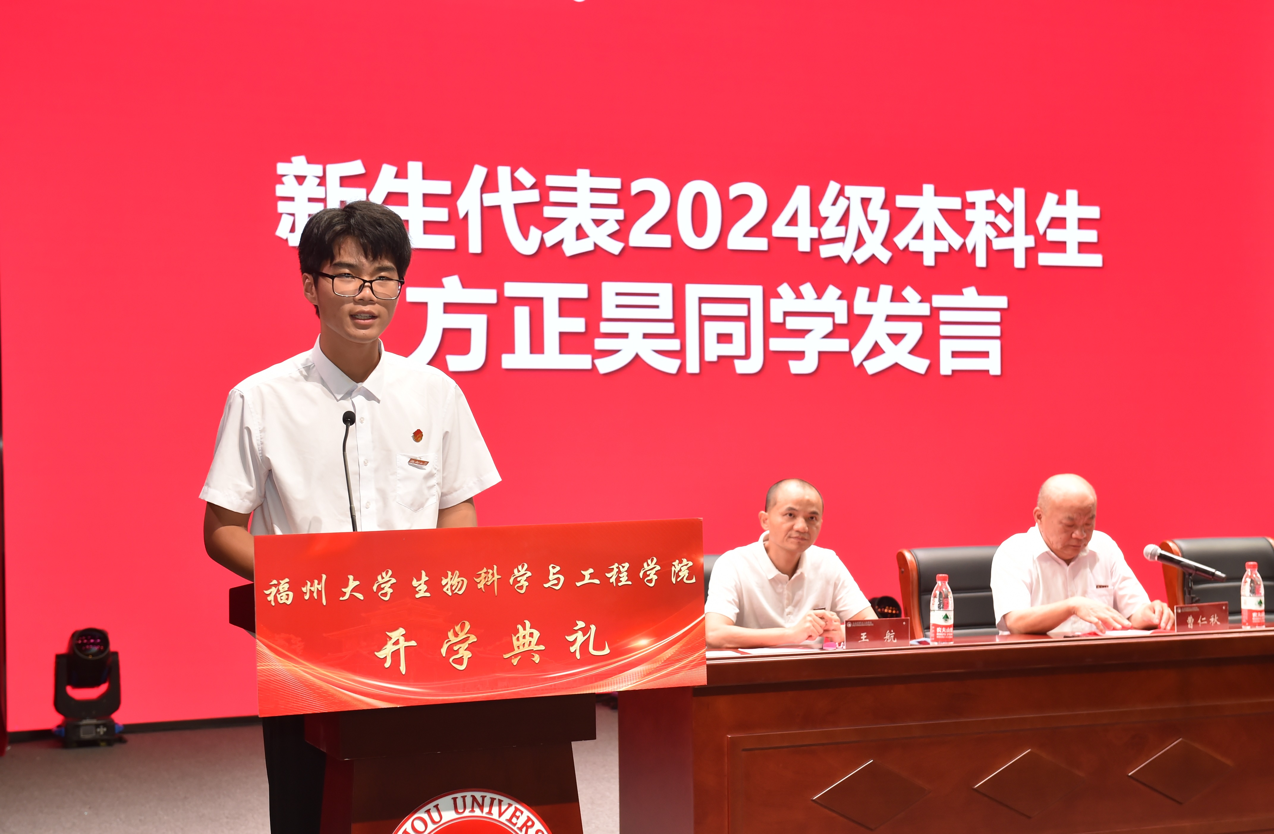 2024级本科生新生代表方正昊同学在发言中与新生们共勉:人生是旷野而非轨道,同学们应勇于尝试,探索未知的领域。作为福大生工青年应以奋斗为长矛,划破黑夜,寻找属于自己的天空。