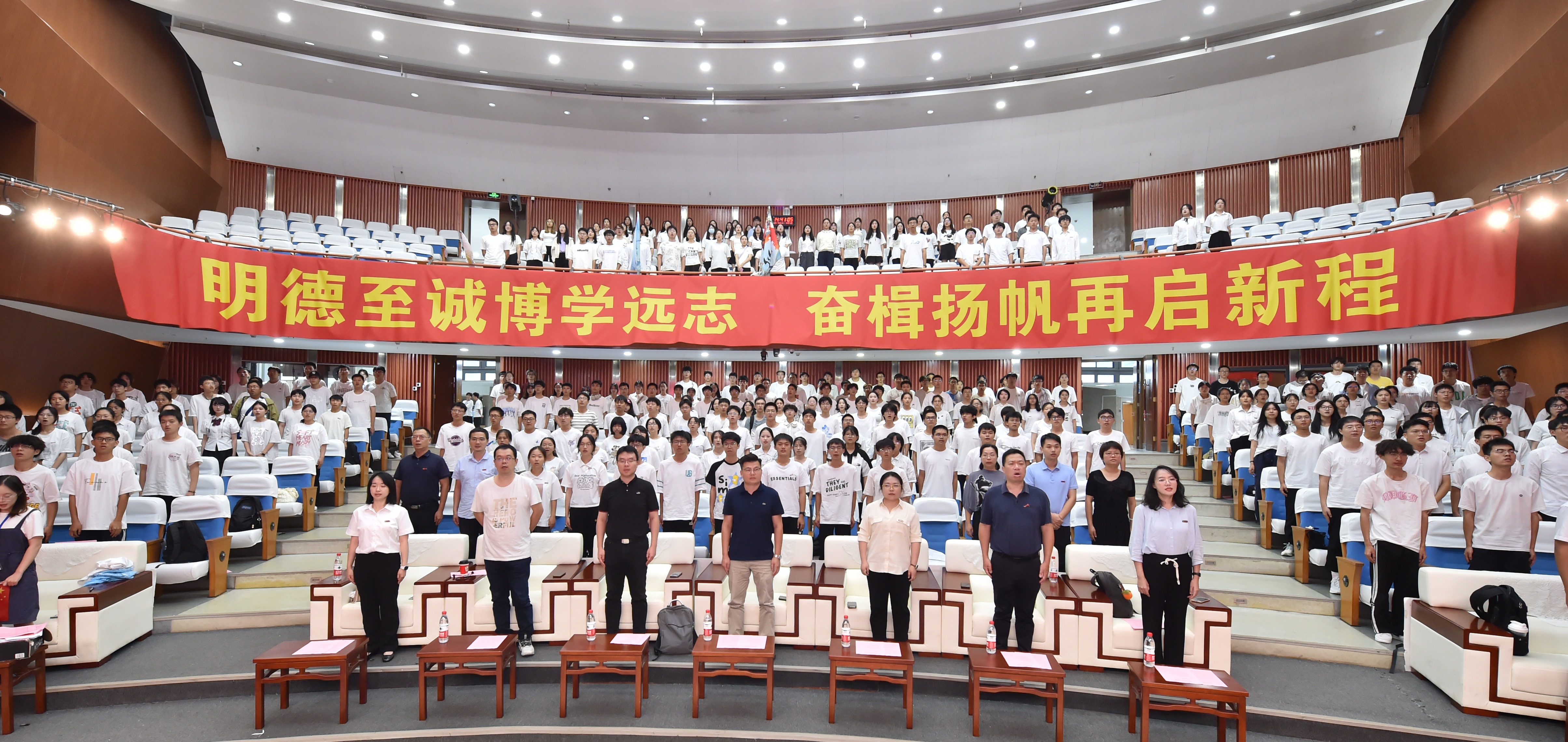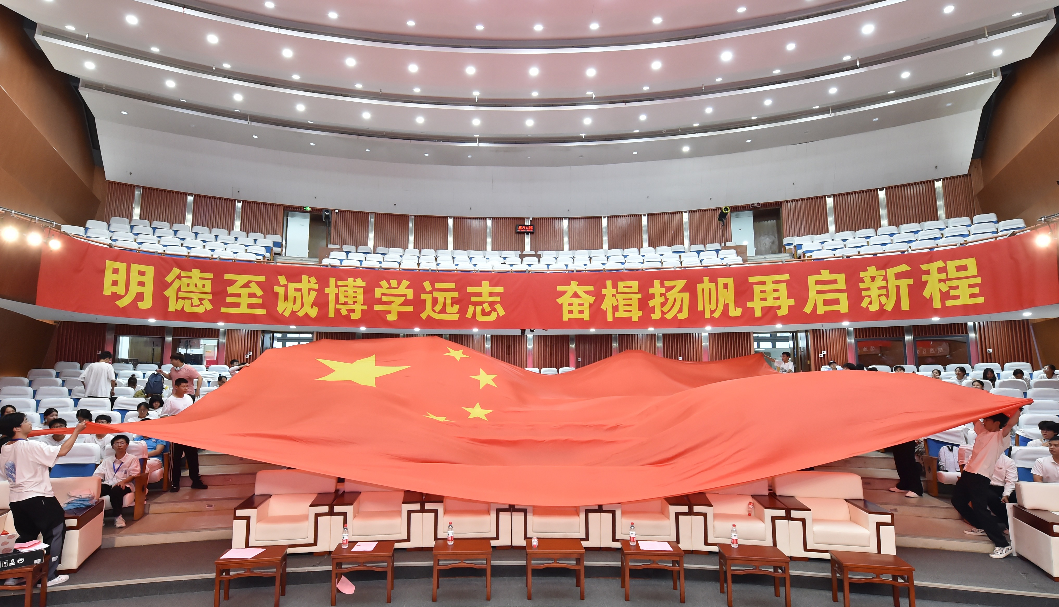 在典礼开始前,与会师生在四位2024级本科新生的带领下一同合唱歌曲《我相信》。伴随着朝气蓬勃的歌声,2024级新生班级代表挥舞手中的班旗。由研究生和本科生12个新生班级同学自行设计的班旗在手中摇曳飘扬,寓意着他们即将在未来的广阔天地中扬帆启航,乘风破浪。随着歌曲的结束,舞动的巨幅国旗如同生生不息的火焰铺展在眼前,新生们齐声高呼“生而闪耀,工无不克,心怀祖国,青春担当”的口号,正式开启开学典礼的序章。