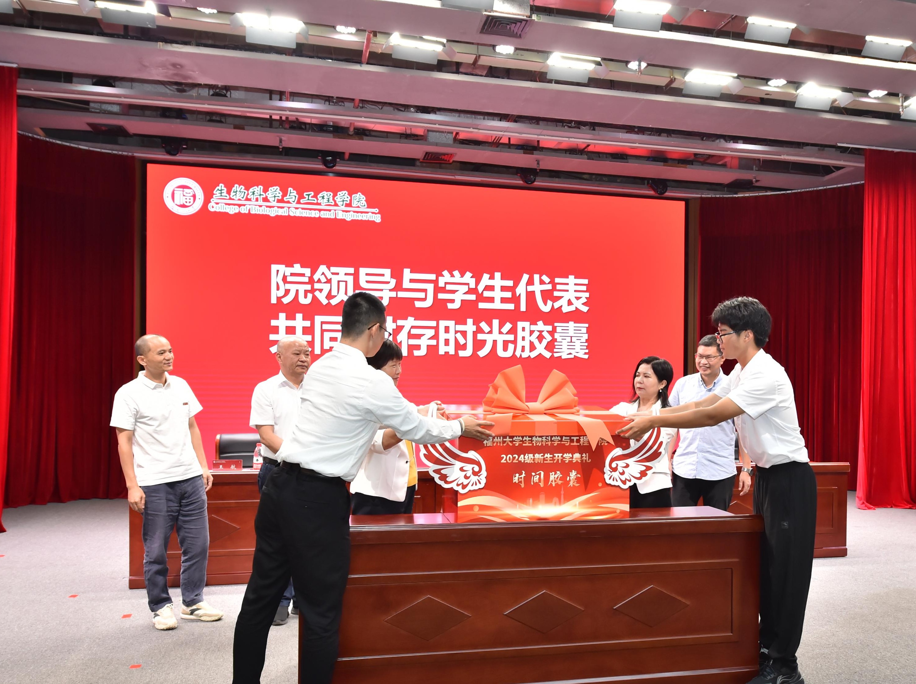 在全体2024级新生的见证下,院领导与新生代表将书写了新生大学梦想和人生愿景的400余张“新生入场券”共同放入时光胶囊中。院党委王秀萍书记和院长汪少芸教授与本科生、研究生新生代表共同将带有翅膀、飘带造型的时光胶囊盒封存,祝愿同学们在毕业之际开启时光胶囊时,能够保持今日的初心、实现今日之梦想,成长为自己理想中的模样。