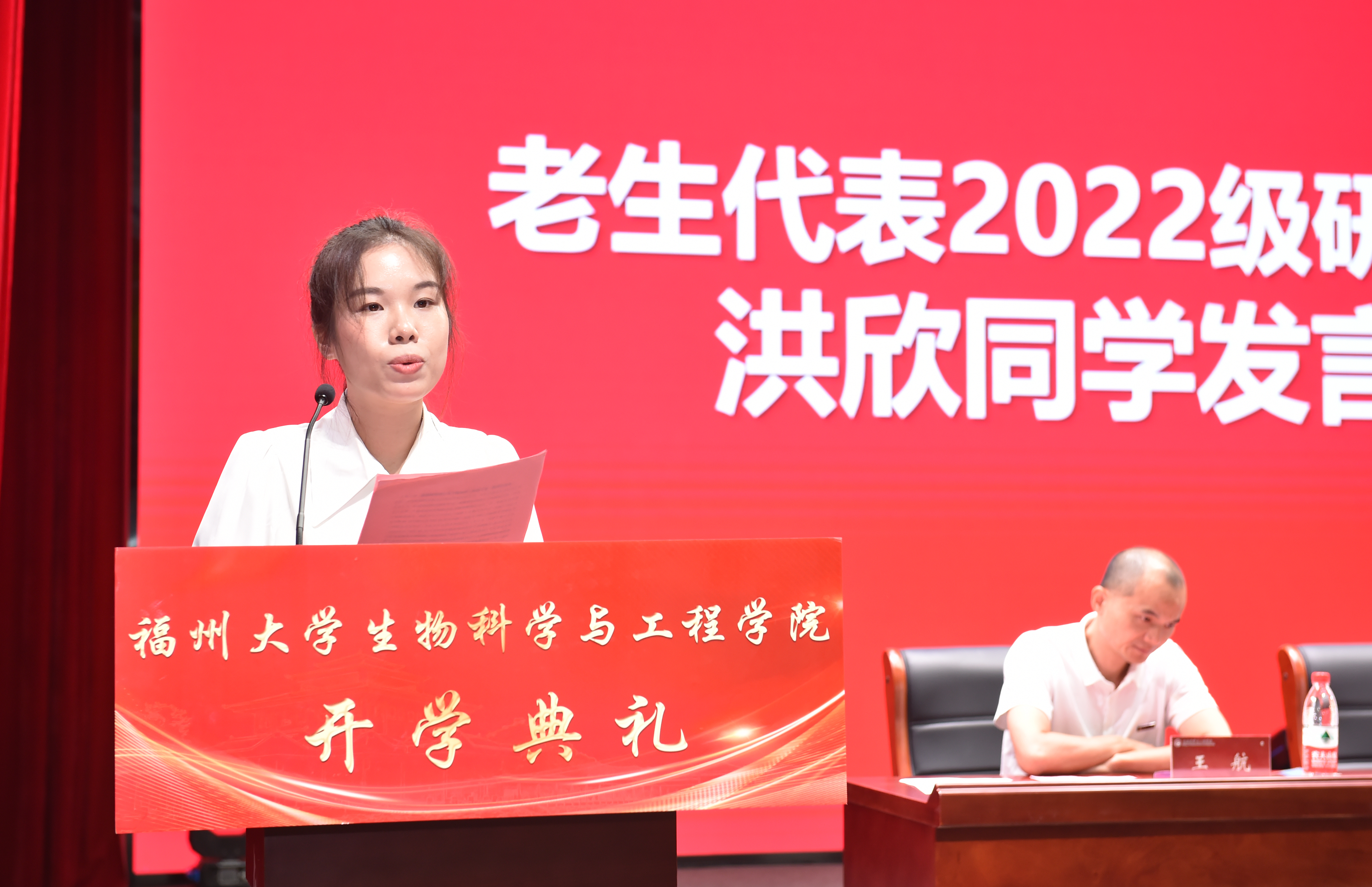 老生代表、院研究生会原执行主席、2022级研究生洪欣同学分享了自己在生工学院学习两年的成长经历和收获感悟:一是脚踏实地、仰望星空,勇担属于自己的时代责任;二是抓住机遇、勇于挑战,绘就属于自己的青春画卷。最后,她鼓励新生们在青春的赛道上奋力奔跑,争做有理想、敢担当的新时代好青年,谱写属于自己的青春华章。