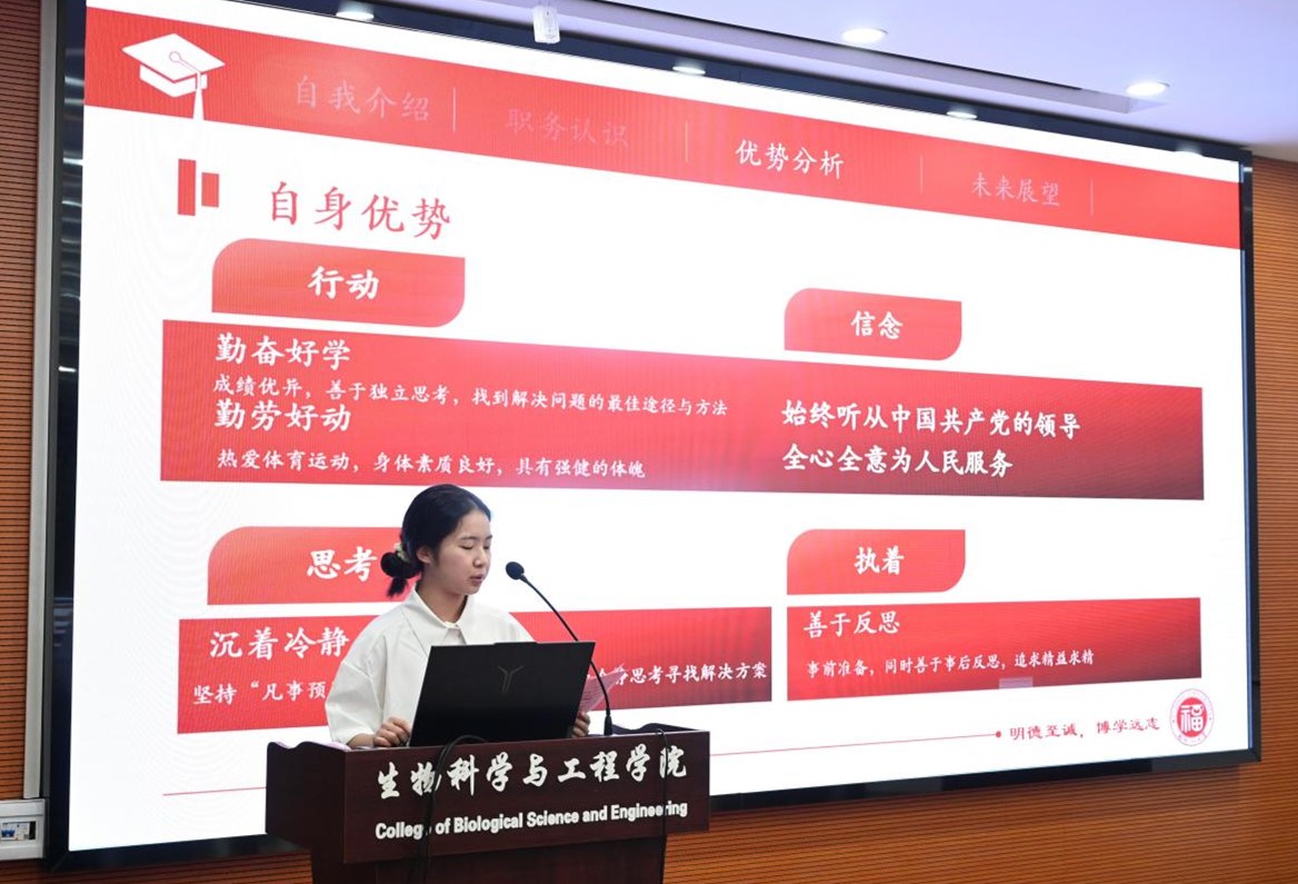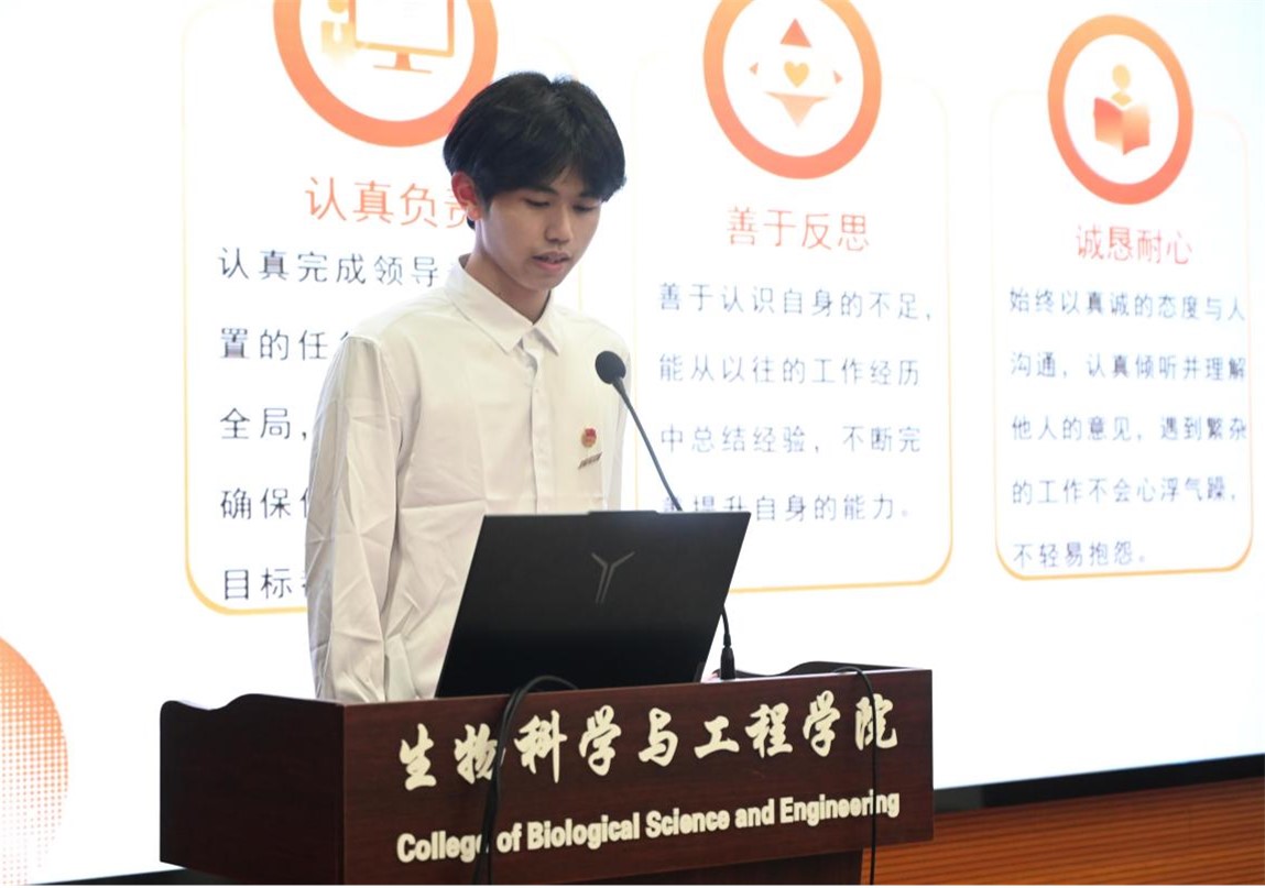 院第四届学生会、研究生会主席团候选人依次进行竞选演讲,他们分别从学生工作经历、个人优势、职务认识等方面进行阐述。
