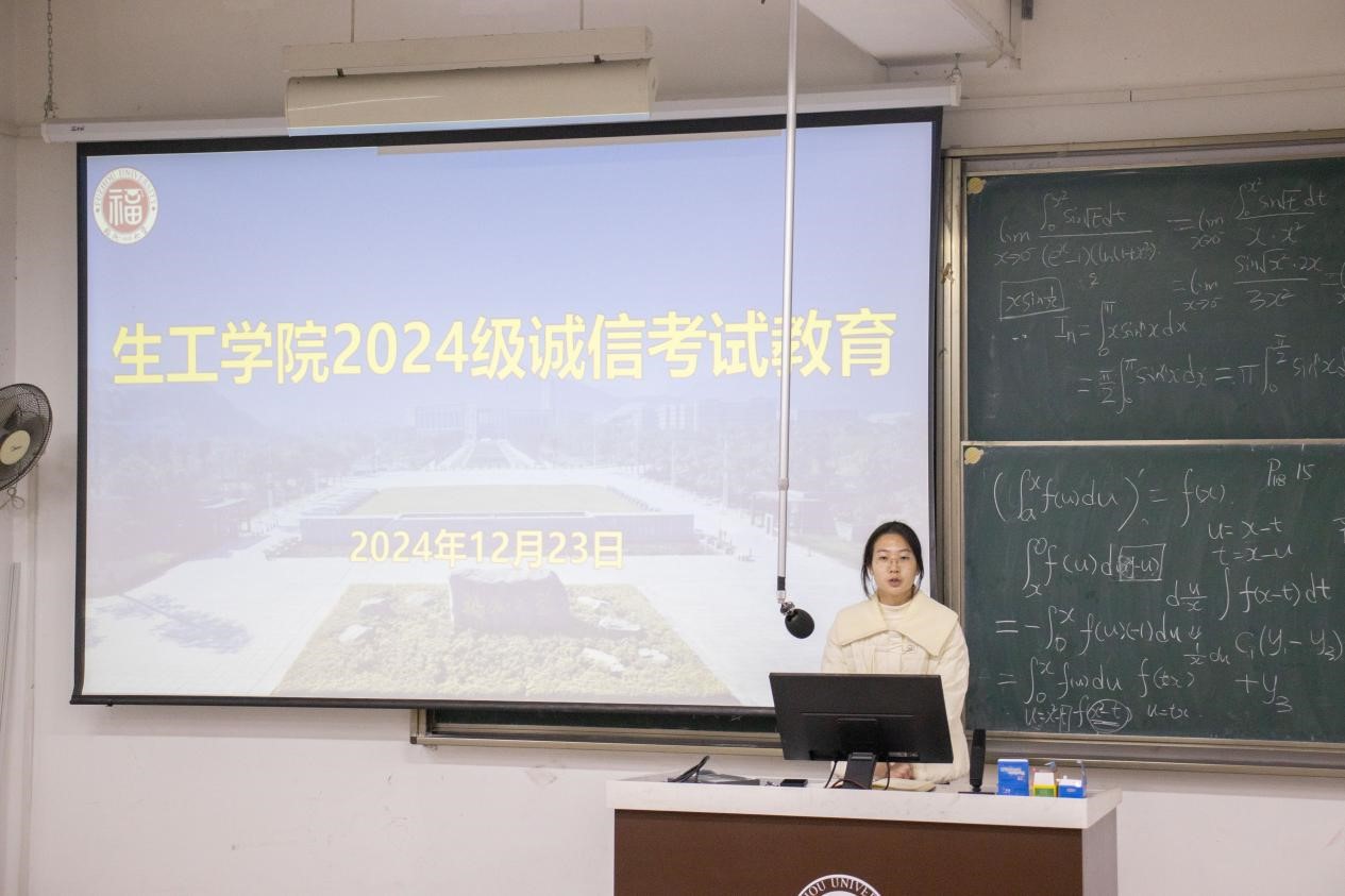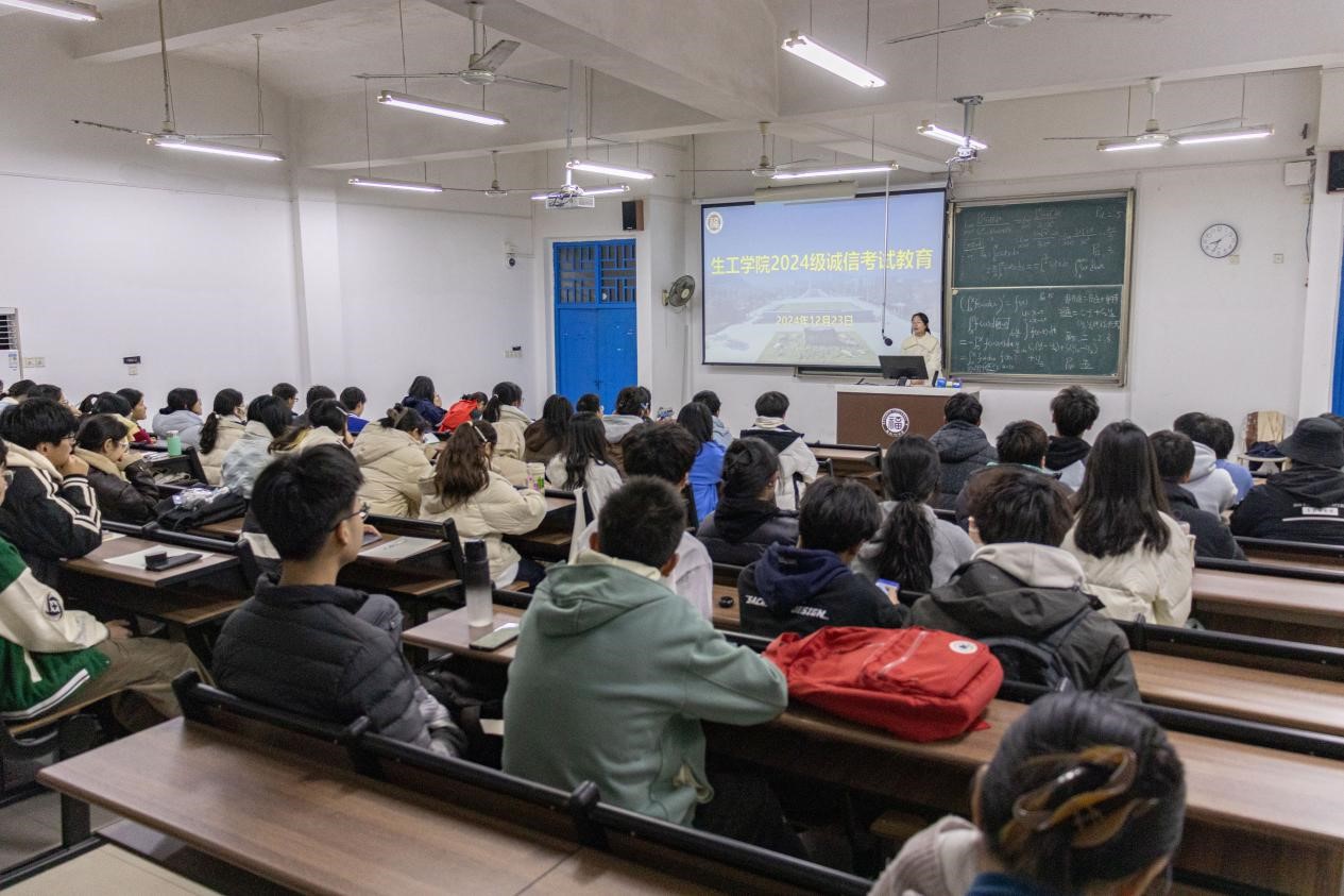 为进一步培养学生诚实守信优良品德,加强学院学风建设,严肃考风考纪,营造科学有序的备考氛围,2024年12月23日,我院通过年段会形式召开2024级本科生期末考试诚信教育大会,会议由2024级本科生辅导员杜美佳主持,生物科学与工程学院2024级本科全体学生参加。