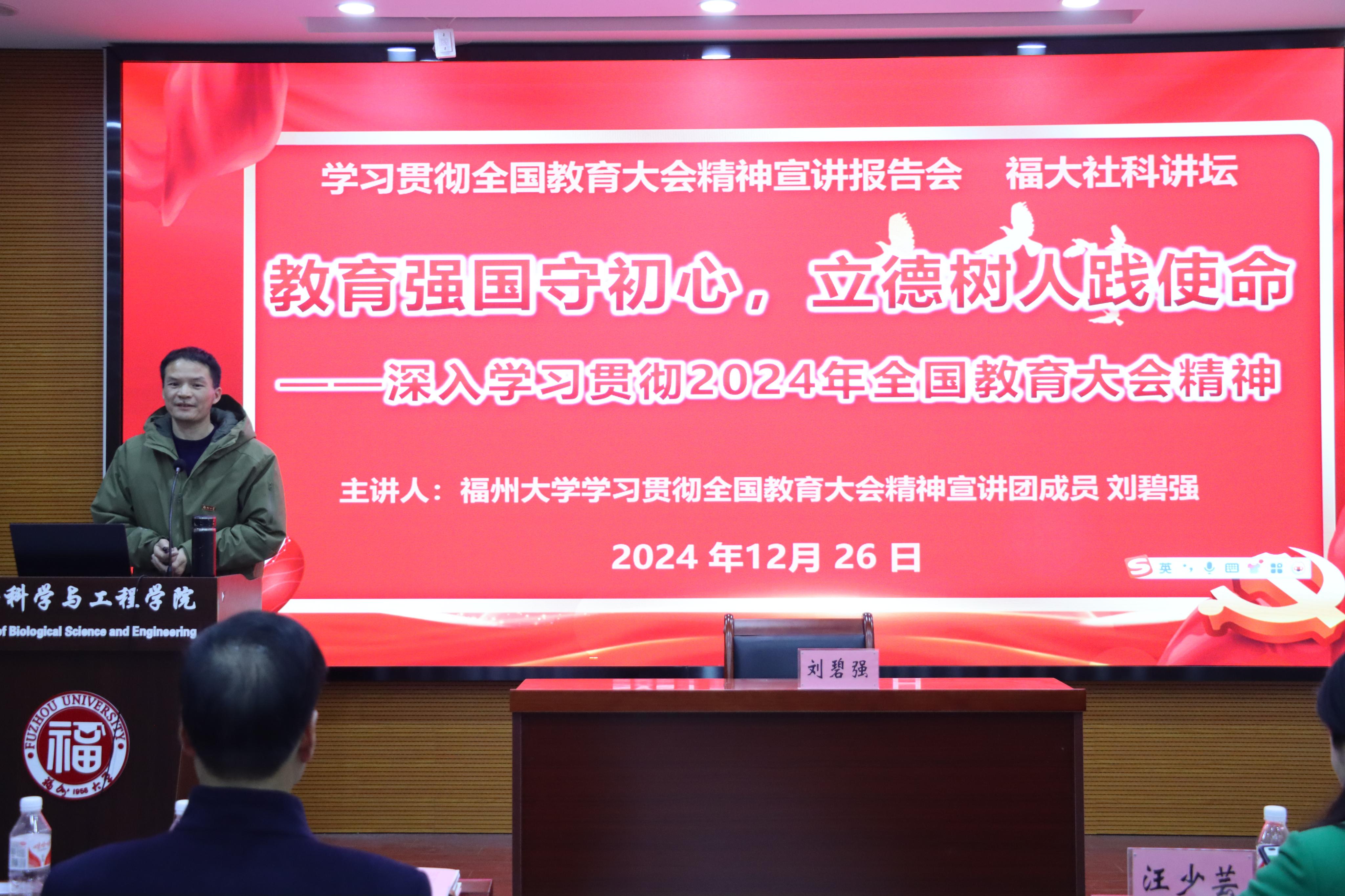 为深入学习和贯彻全国教育大会精神,12月26日,生物科学与工程学院特别邀请了福州大学学习贯彻全国教育大会精神宣讲团成员,经济管理学院的刘碧强副教授,围绕习近平总书记关于教育的重要论述及其在福建工作期间关于教育工作的探索与实践,为全院师生带来了一场精彩的专题宣讲。