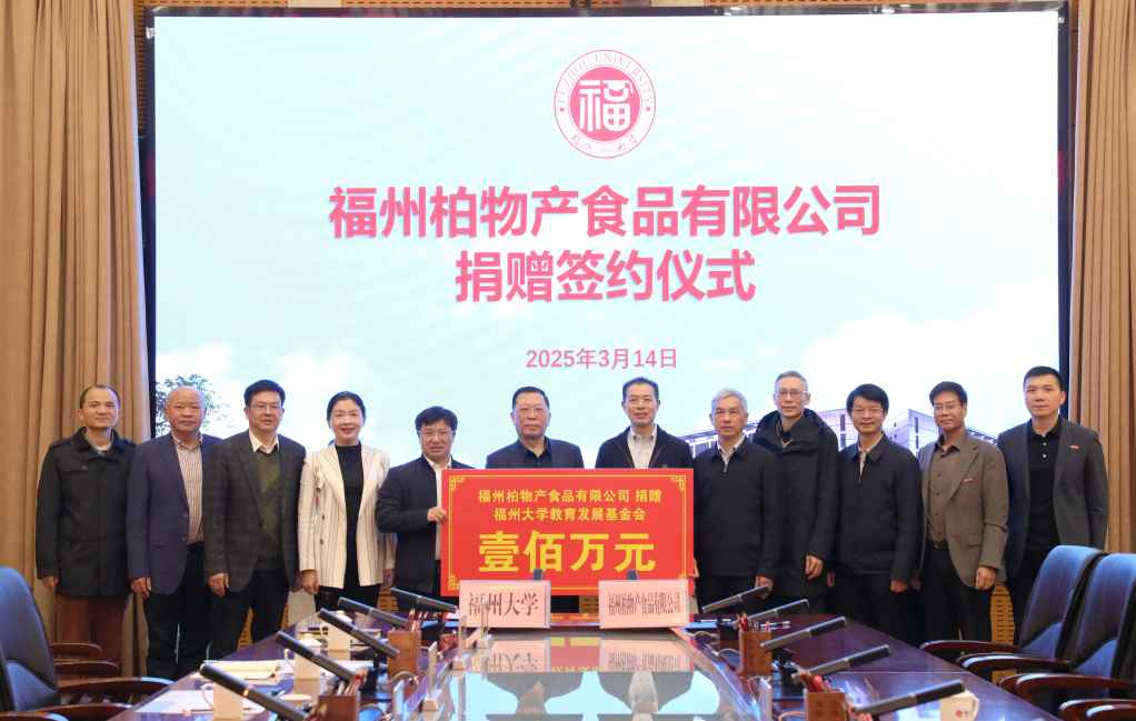 3月14日上午,福州柏物产食品有限公司捐赠签约仪式在旗山校区举行。仪式上,福州柏物产食品有限公司向福州大学捐赠100万元,设立“柏物产教育发展基金”,用于支持生物科学与工程学院、医学院教育事业发展。柏物产集团董事长陈熹(福州大学1980级轻工校友、福州大学日本校友会会长)、福州柏物产食品有限公司副总经理陈进(福州大学1980级轻工校友)、福州大学党委书记陈国龙、副校长江莉龙出席捐赠签约仪式,仪式由江莉龙副校长主持。