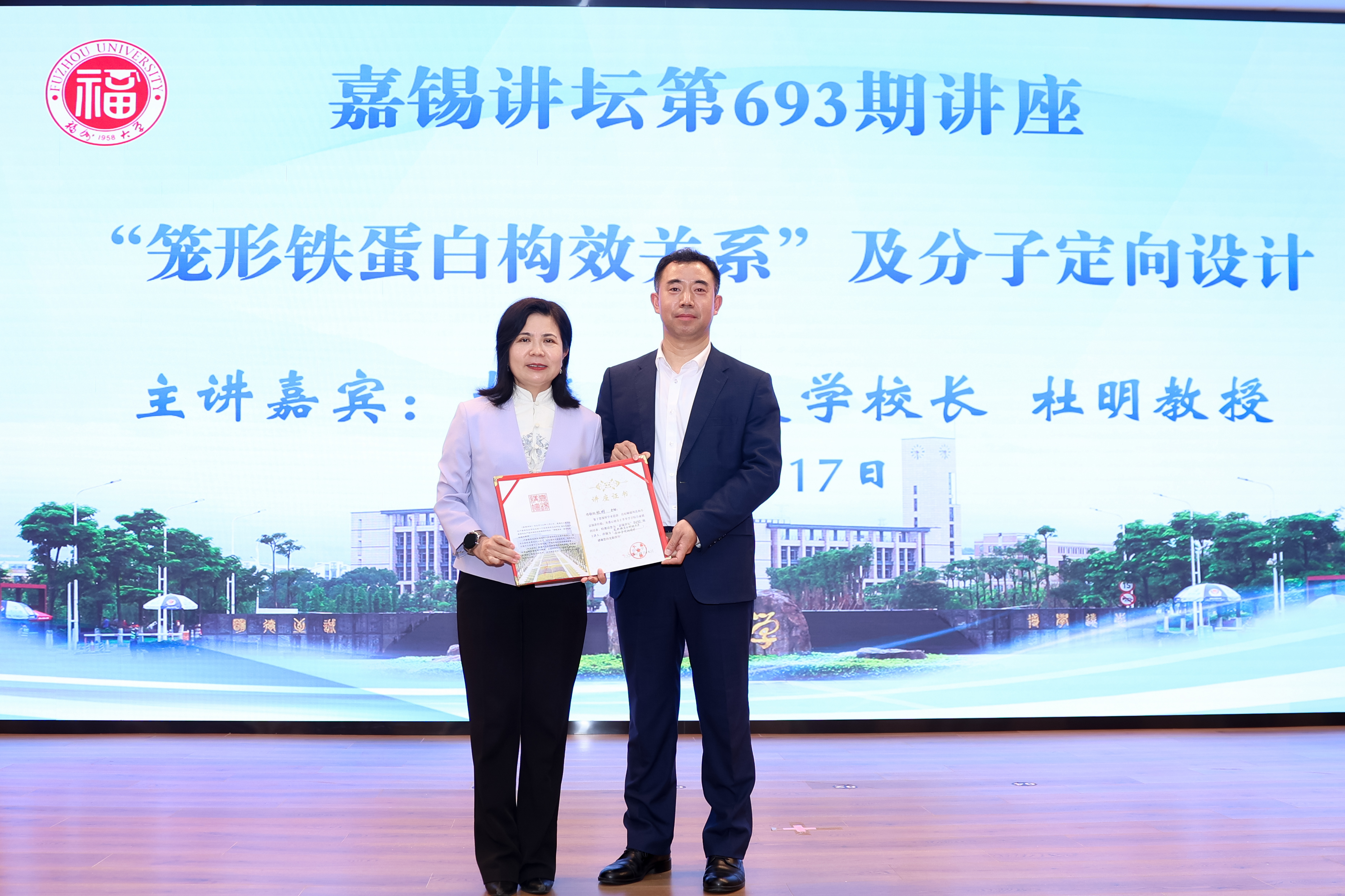 4月17日,由福州大学图书馆和我院主办的嘉锡讲坛第693期讲座在晋江楼一楼报告厅举行。大连海洋大学校长、博士生导师杜明教授应邀作题为《笼形铁蛋白构效关系及分子定向设计》的专题报告。校党委常委、副校长杨黄浩教授热情会见杜明校长,学院院长汪少芸教授主持讲座,全校200余名师生共同聆听了学术报告。