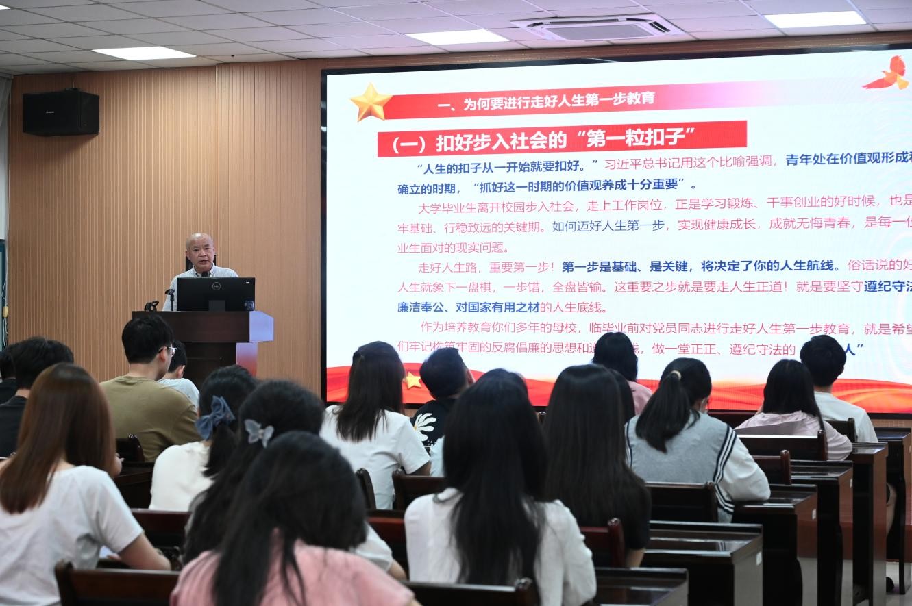 曹仁秋副书记首先以“为什么要进行走好人生第一步教育”为切入点,阐释毕业生党员步入社会的扣好人生“第一粒扣子”的重要性。并聚焦中央八项规定精神的深刻内涵,分析了当前反腐败斗争形势严峻复杂性,通过典型案例生动诠释了廉洁自律的重要性,警示毕业生党员坚守廉洁底线,引导毕业生党员筑牢信仰之基、补足精神之钙、把稳思想之舵。他寄语毕业生党员们:一是以理想信念为根基,筑牢廉洁修身的思想防线,二是以清廉文化为滋养,升华廉洁修身的精神境界,三是以清廉美德为指引,永葆廉洁修身的道德操守。他希望毕业生党员铭记福州大学“明德至诚,博学远志”的校训和福大“三种精神”,在未来生涯的起航期扣好廉洁修身的“第一扣”。
