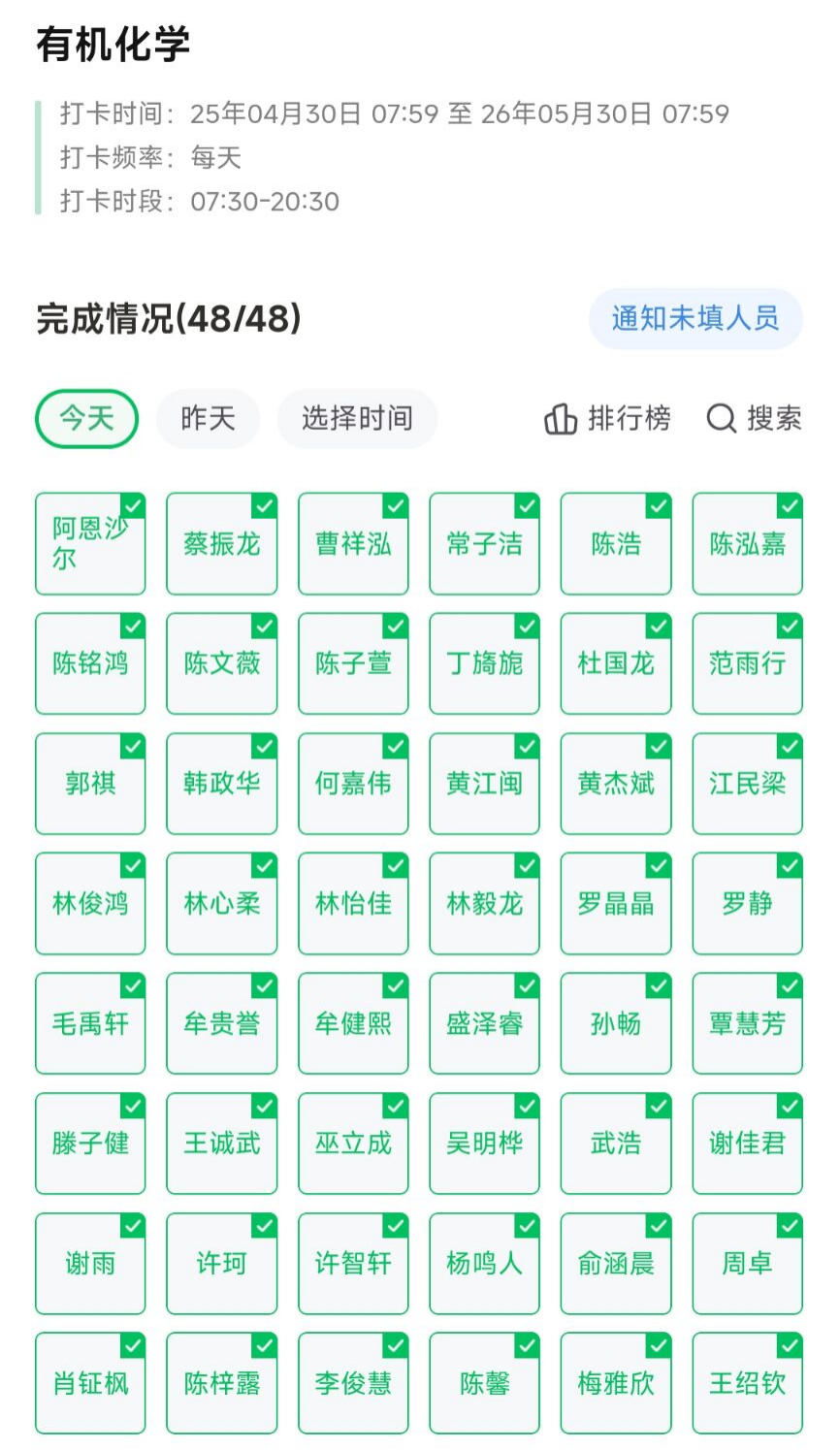 课堂纪律是学习效果的重要保障。为营造尊师重教、勤学守纪的良好学习氛围,我院2024级本科生年段通过“生工勤学者·课堂全勤行”打卡活动,进一步强化了课堂纪律管理。学院利用学风考勤线上点名系统,要求学生每天上课前进行实名考勤打卡,确保出勤情况的真实准确。同时,辅导员和班委不定期对课堂出勤情况进行抽查,对缺勤学生及时进行沟通和督促。这些措施的实施,有效提升了学生的课堂参与度,营造了良好的学习氛围。