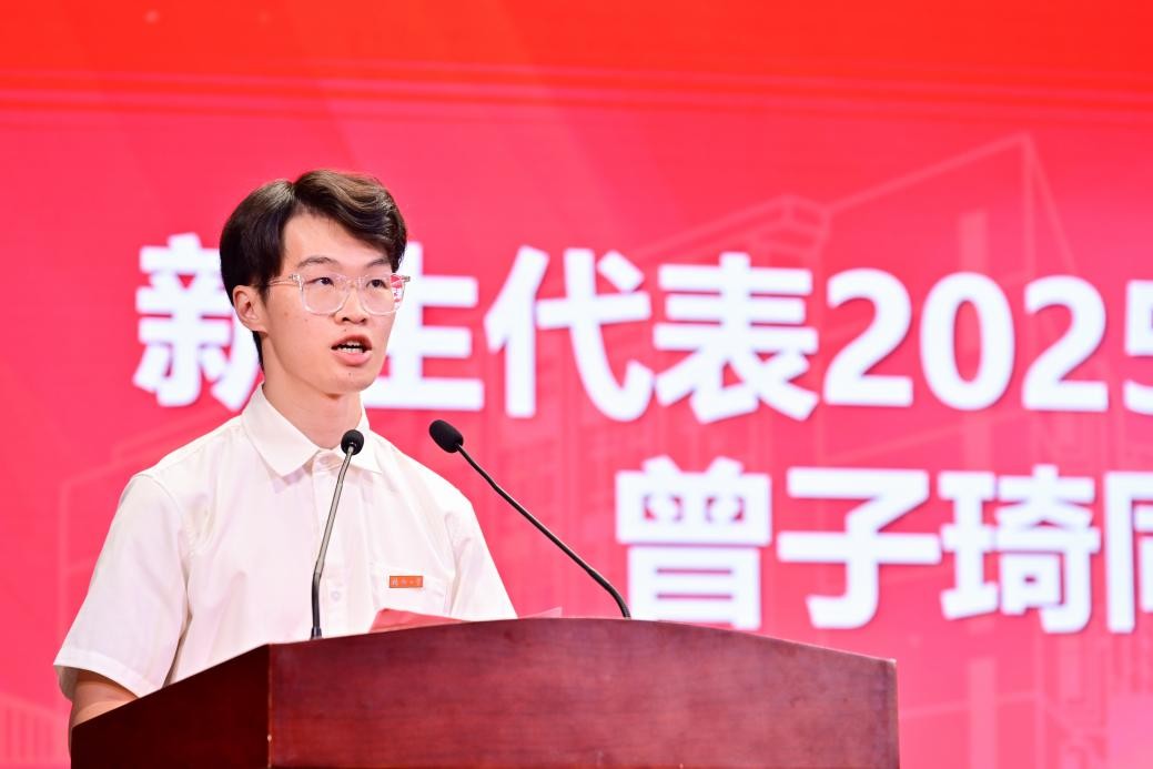 2025级博士新生曾子琦同学作为研究生新生代表发言,他深情回顾了在福大从本科到博士的成长历程,分享了自己从行政保研到投身科研的感悟。他提到,选择攻博源于对科学探索的纯粹热爱,未来将深耕生物材料与组织工程领域,力求在理论与应用层面实现突破,助力医学与健康事业发展;同时坦言科研虽有艰辛,但在福大师生的陪伴下,将始终以“明德至诚、博学远志”为训,勇攀科研高峰,成长为堪当民族复兴重任的时代新人。