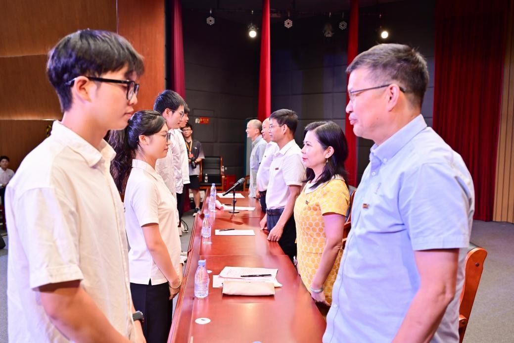 开学典礼在庄严雄壮的国歌声中正式开始。首先举行的是新生佩戴校徽仪式,学院领导与会老师亲自为2025级本科及研究生新生代表佩戴校徽并合影留念。这枚校徽不仅是“福大人”身份的象征,更寓意着全体2025级新生正式融入生工大家庭,肩负起生工学子的责任与使命。