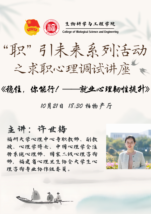 进一步提升我院毕业生就业指导服务质效,扎实推动2026届毕业生高质量充分就业,10月21日晚,一场以《稳住,你能行!——就业心理韧性提升》为主题的求职心理调适讲座,在生工北楼柏物产厅顺利举行。