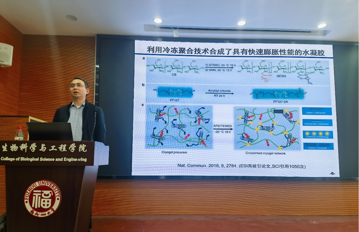 10月24日上午,西安交通大学郭保林教授应汪少芸院长邀请做客我院“生工讲坛”,在生工北楼二楼柏物产厅作了题为《快速止血和促组织修复多功能水凝胶》的学术报告,吸引了众多师生到场聆听与交流。