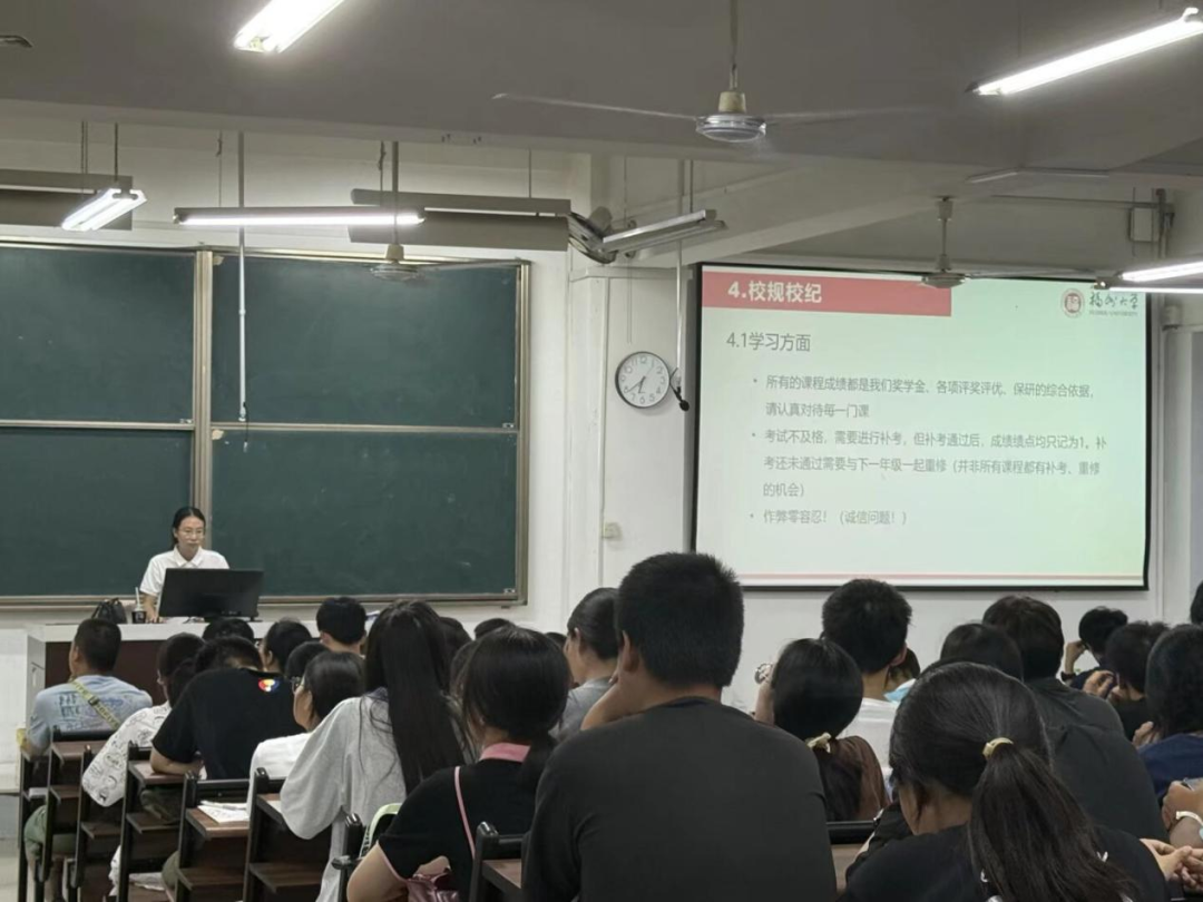 杜老师系统梳理了《福州大学学生手册》中的关键内容,重点围绕学籍管理、考试纪律、宿舍管理、奖惩制度等方面进行深入解读,明确行为规范与底线要求。她特别对课堂出勤、晚点名、熄灯制度等日常管理细节作出说明,并结合真实案例,生动阐释了违纪行为的后果,帮助新生清晰理解规章条款的现实意义。