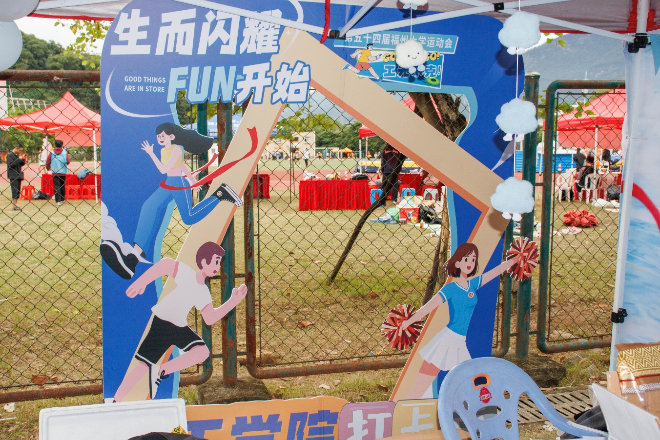 “生而闪耀,青春无畏,攻无不克,筑梦扬威”,kt板上的誓言彰显了学子“会当水击三千里”的气魄与追求。而在横幅下的打卡点以“生而闪耀”为主题,蓝色为主体的学院代表色彰显生机,啦啦队形象的人物传递热情氛围。