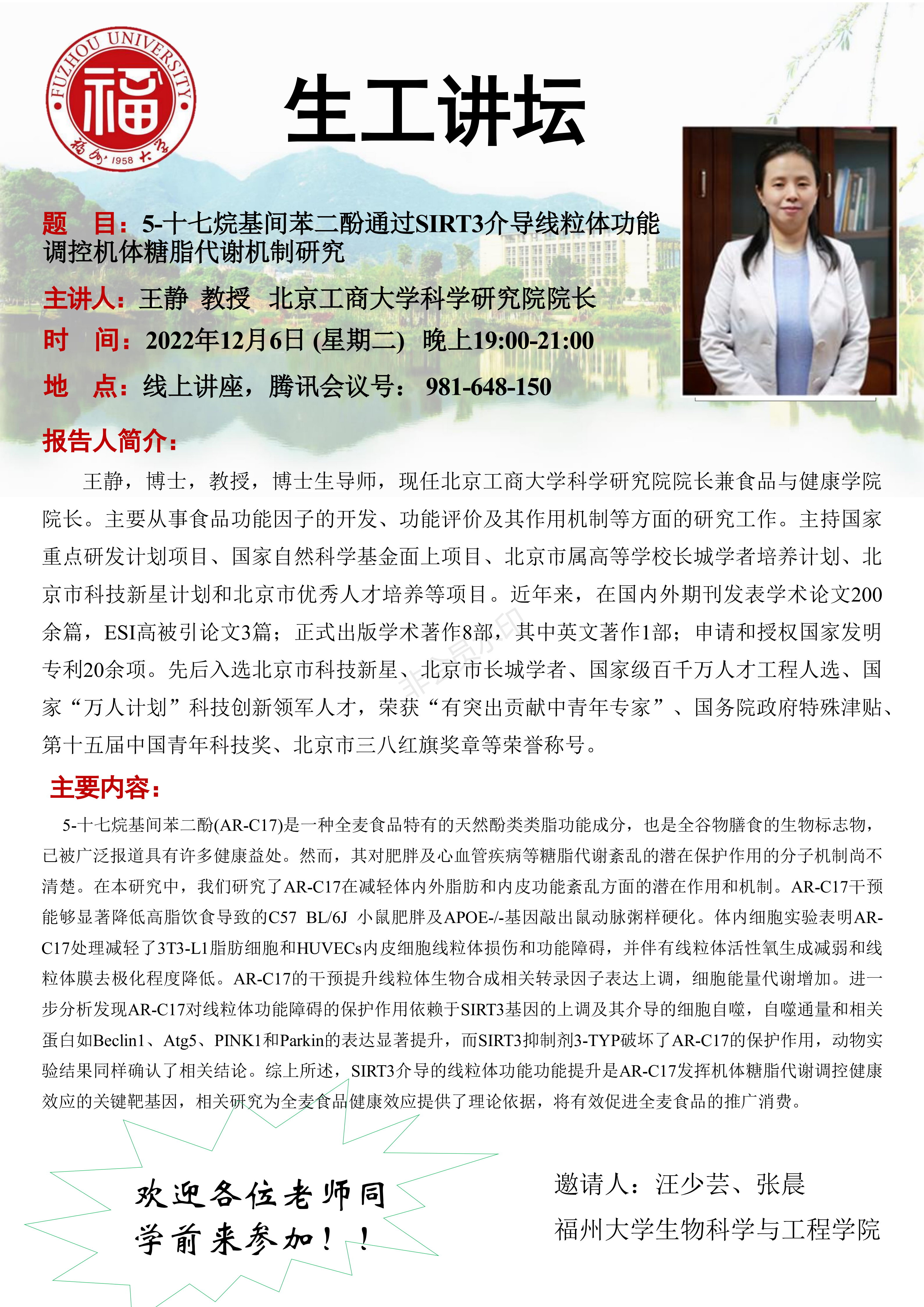 生工讲坛:12月6日5-十七烷基间苯二酚通过SIRT3介导线粒体功能调控机体糖脂代谢机制研究