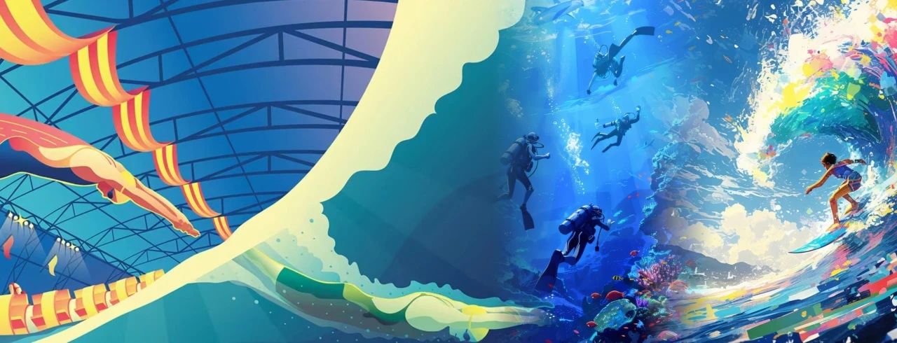 夏日海洋板块,由运动员跃入泳池、潜水员潜入深海、冲浪选手驰骋在海浪之上这三个画面组成,彰显着生工学子"乘风破浪会有时,直挂云帆济沧海"的坚定信念。