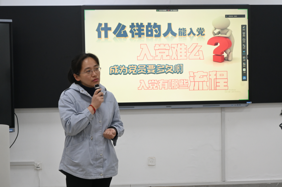 3月22日晚,校党委组织部林舒老师以《入党积极分子的培养考察:积极向党组织靠拢》为题讲授培训班第二讲,林舒老师细心讲解了发展党员工作的要求、原则,发展党员工作流程,入党积极分子的培养考察的重点。她走下讲台,近距离与学员们展开互动,鼓励同学们以身边优秀党员为榜样,坚定理想信念,争取早日入党。