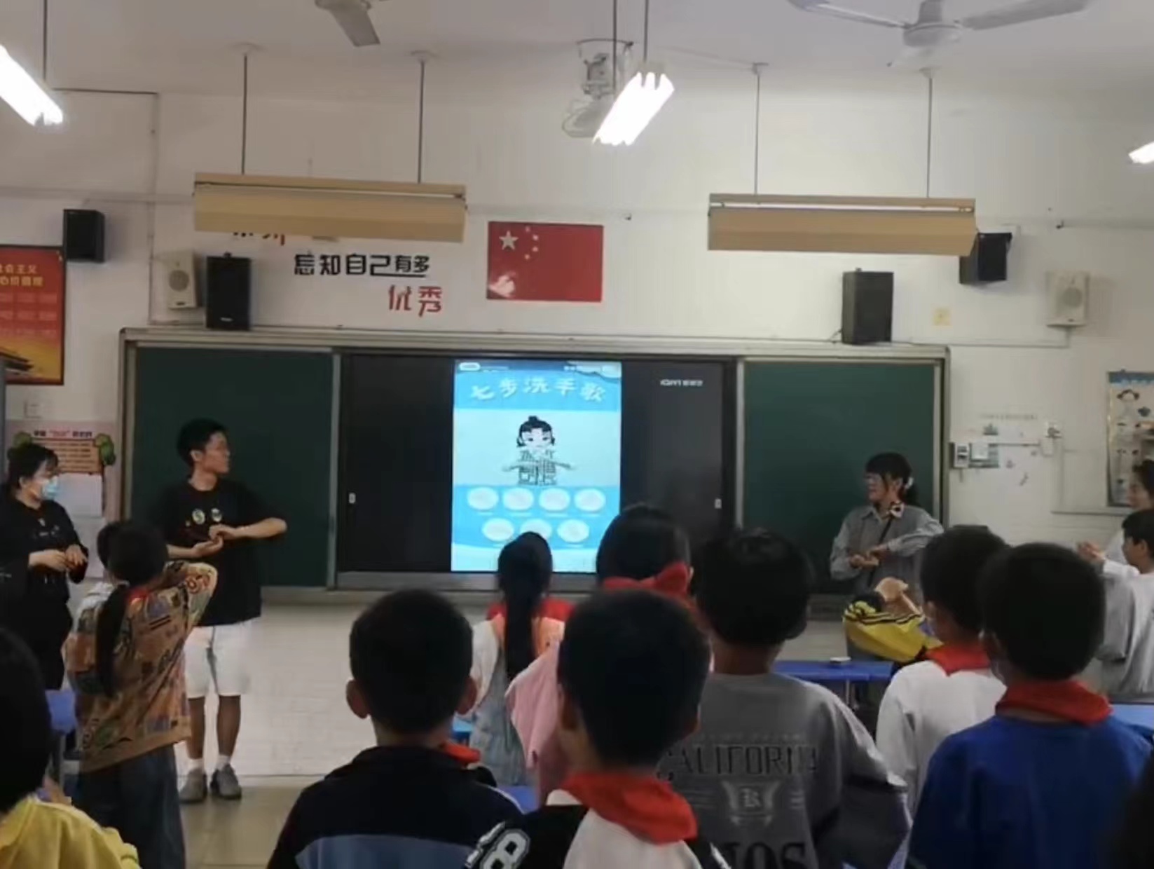 “什么是流感?”“流感有什么症状呢?”学硕党支部的龚锦雯同志科普与提问结合的讲授方式引起了小朋友们的极大兴趣,同学们踊跃举手、畅所欲言,现场氛围十分轻快活跃。提问环节结束后,党员志愿者们播放了流感病毒作用机制和防治方法的动画视频,用生动有趣、简单易懂的方式,加深了小朋友们对于流感知识的理解。在科普宣讲结束后,在支委黄娜同志的带领下,参与活动大学生和小朋友们一起跟随视频的节拍做洗手操。