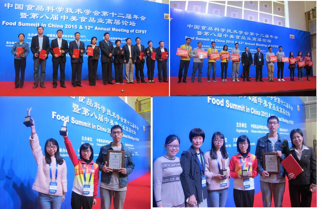 2015年10月20-22日,中国食品科学技术学会第十二届年会暨第八届中美食品业高层论坛在大连召开, 作为食品行业的年度盛会,会议受到了中国食品科技与产业界的高度关注,为期两天的年会吸引了来自食品产业和科技界的1300余名代表参与,以娃哈哈宗庆后董事长为代表的数十家大型企业负责人的到会,彰显了中国食品科技力量与产业创新需求正有效对接。在本次会议上,我院汪少芸教授获得“中国食品科学技术学会科技创新奖——杰出青年奖”和科技创新优秀论文二等奖,张雯副教授获科技创新优秀论文三等奖;在倪莉教授和张雯副教授的指导下,我院王艺静、林旺彬和胡钊颖等同学组成的创新团队的作品“夏物语——奶香擂茶冰棒”和“五谷家味”在学生食品创新比赛中分获杜邦海峡两岸食品创新大赛二等奖和盼盼食品创新大赛三等奖,杨雪纯、杨茹婷等同学的作品“闽式蒜蓉香辣酱”获得李锦记杯学生创新大赛最佳工艺奖。