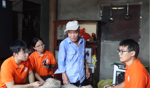 在走访过程中,实践队拜访了四斗村一位老党员,聆听其关于传统红薯粉制作工艺、乡村生活变迁以及畲族文化的讲述。得益于优越的温度和光照条件条件,四斗村的红薯高产优质,相关产品一直供不应求。“红薯要选红皮的,晒到表皮发皱才够味。”有着40余年党龄的老党员雷大爷,向队员们讲述传统红薯粉和红薯粉条的制作工艺。院角石磨与粉碎机并置,设备的创新提升了生产效率,但关键工序仍由人守护。“磨完的浆多滤几遍,这步机器替不了,不然粉里有渣,煮的时候会散”。竹匾上的粉块,承载着数十年经验凝结的水质、力道、晾晒时长的精准把握。