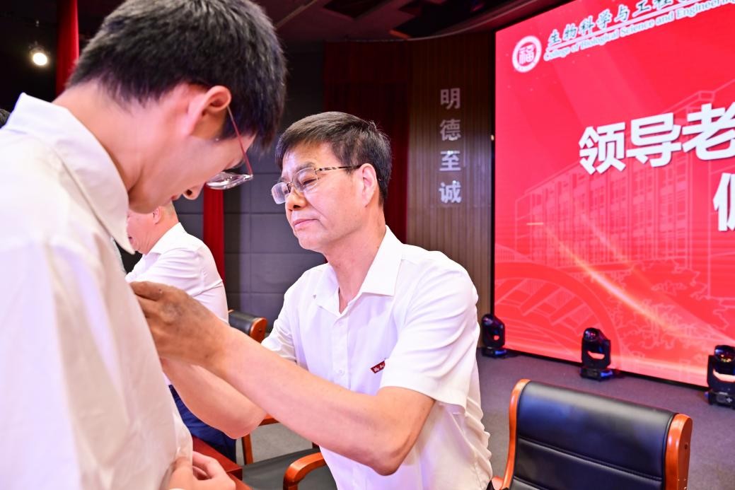 开学典礼在庄严雄壮的国歌声中正式开始。首先举行的是新生佩戴校徽仪式,学院领导与会老师亲自为2025级本科及研究生新生代表佩戴校徽并合影留念。这枚校徽不仅是“福大人”身份的象征,更寓意着全体2025级新生正式融入生工大家庭,肩负起生工学子的责任与使命。