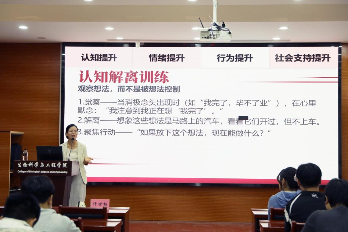 进一步提升我院毕业生就业指导服务质效,扎实推动2026届毕业生高质量充分就业,10月21日晚,一场以《稳住,你能行!——就业心理韧性提升》为主题的求职心理调适讲座,在生工北楼柏物产厅顺利举行。
