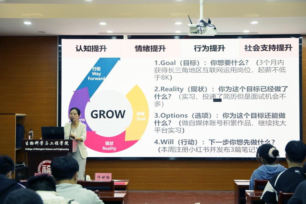 本次讲座特邀福州大学心理中心专职教师、心理学博士、中国心理学会注册心理师、国家二级心理咨询师许世梅副教授作为主讲老师,为毕业生们带来一场聚焦大学成长与求职挑战的深度心理赋能讲座。