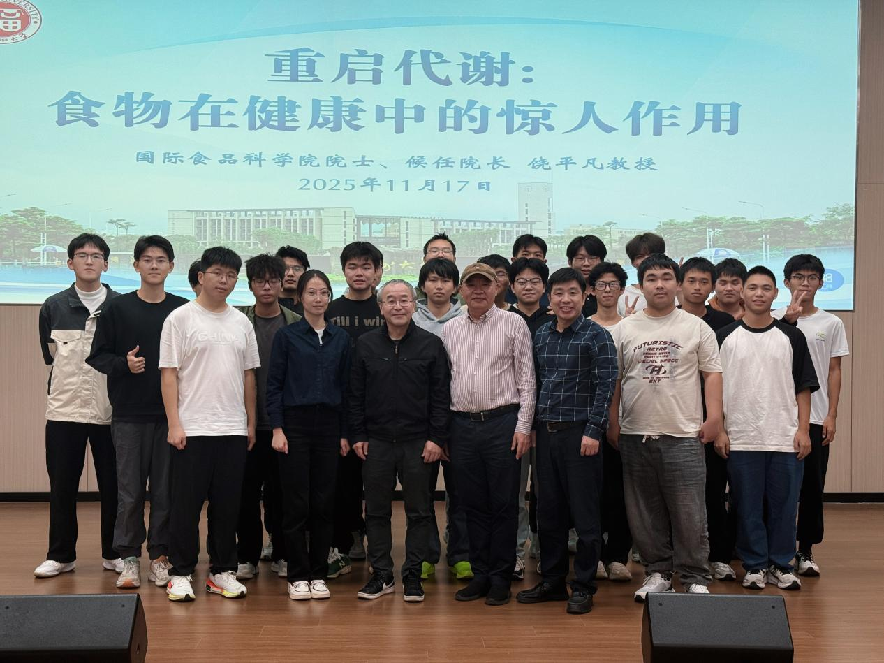 为启迪新生专业思想,引领生工学子深入探索生物科学与食品领域的前沿动态,2025年11月17日晚,国际食品科学院院士、候任院长、我院1978级食品工艺专业校友饶平凡教授做客《生工讲坛》,为我院2025级新生带来主题为《重启代谢:食品在健康中的惊人作用》的精彩学术报告。报告会由院党委曹仁秋副书记主持,学院刘树滔教授、杜美佳老师和180多位新生共同聆听了报告。