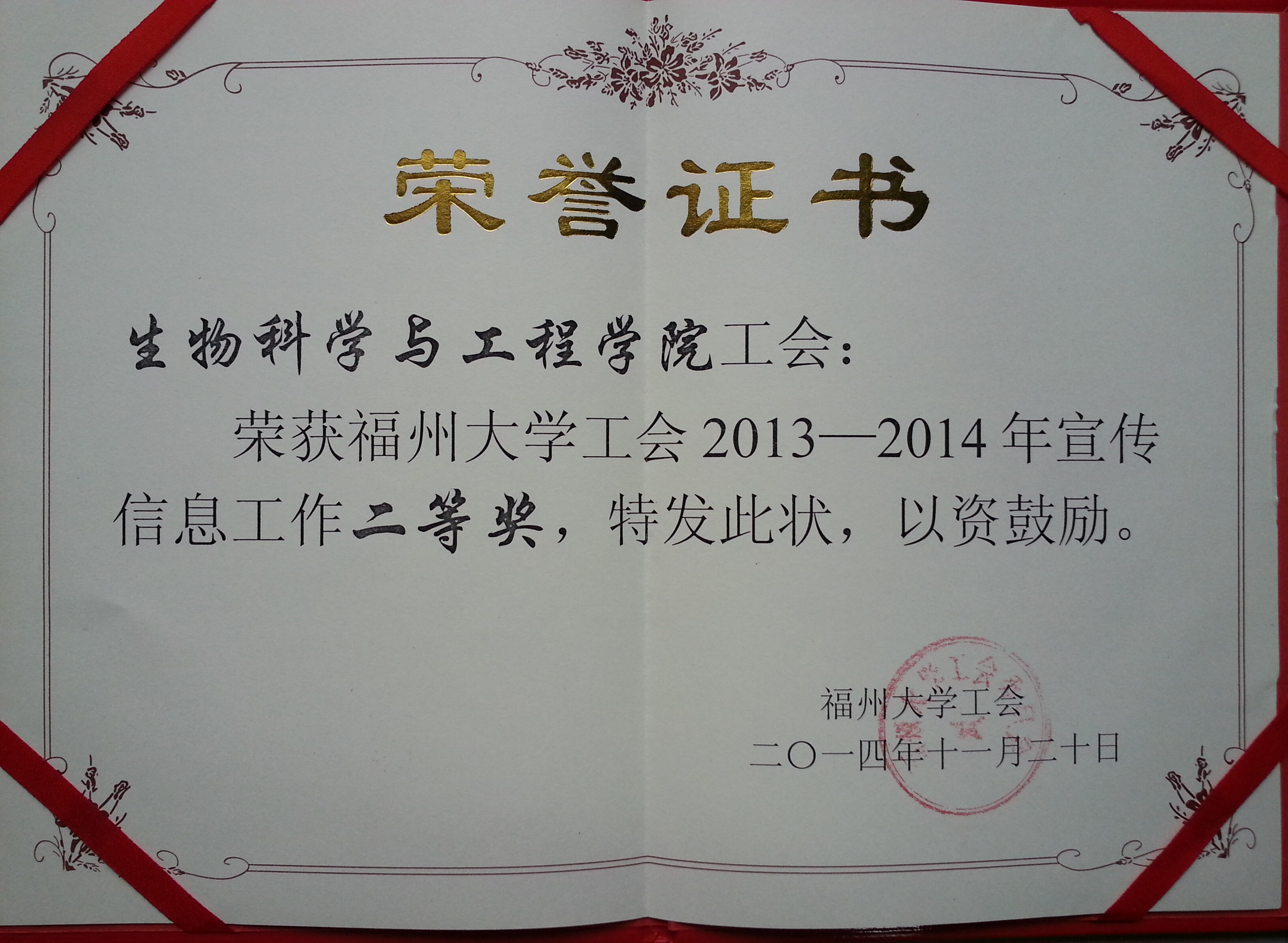 祝贺我院工会荣获福州大学工会2013-2014年宣传信息工作二等奖