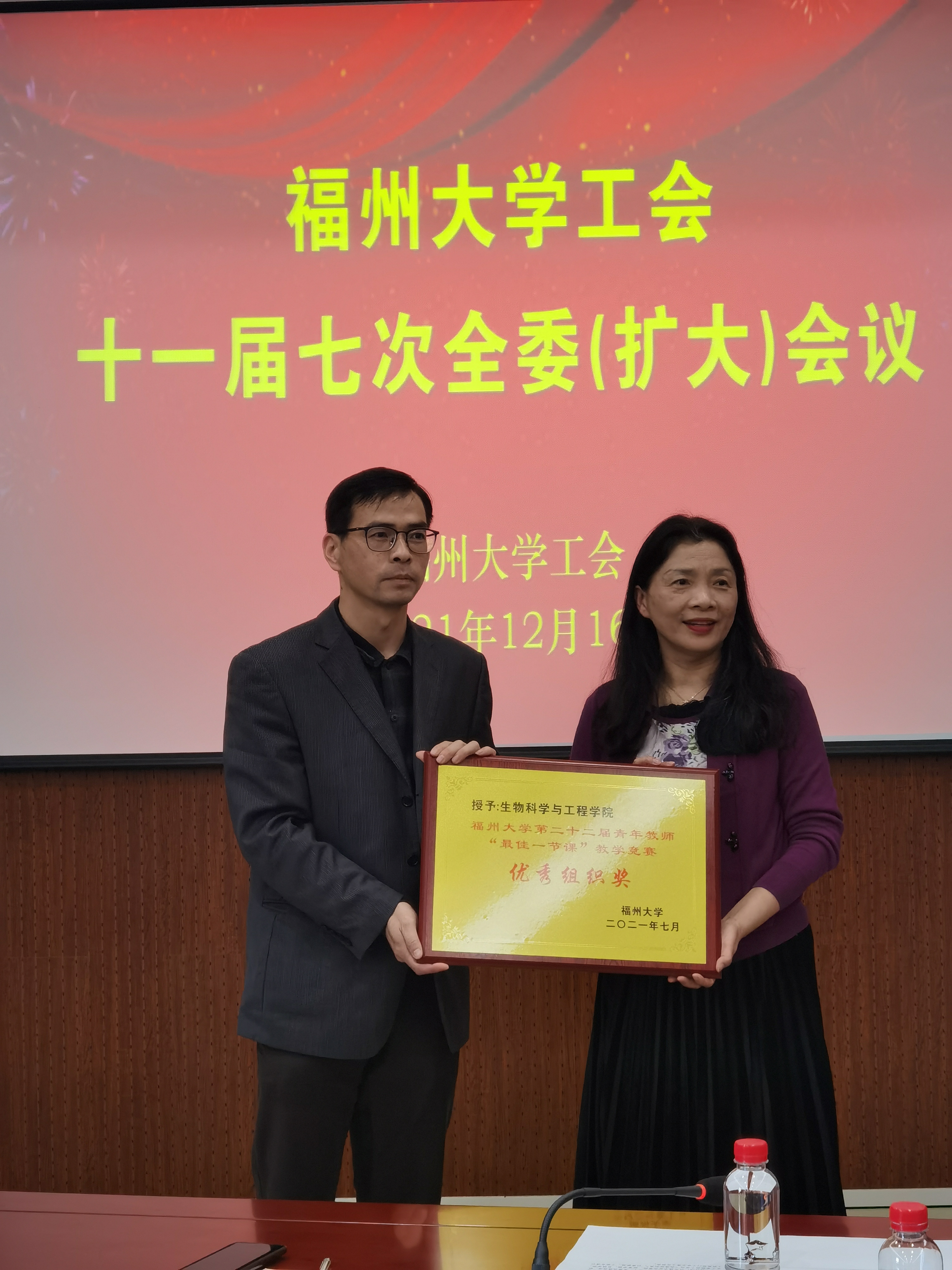 由校工会、教务处主办的福州大学第二十二届青年教师“最佳一节课”教学竞赛优秀组织奖近日揭晓,我院凭借优秀的组织工作和良好的竞赛成绩,成为四个获奖单位之一。学院工会主席张志雄老师从校工会常务副主席程玉敏老师手中接过奖牌。