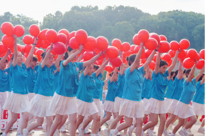 同学们满怀激情,手持火红的气球,排列出“75”的字样,以此庆祝祖国75周年华诞。一支舞蹈,充盈着对祖国母亲真挚的爱意。舞蹈结束之际,舞者放飞气球,鲜艳的气球如同冉冉升起的太阳,象征着我们的祖国在世界的广阔天地中闪耀出熠熠光辉。