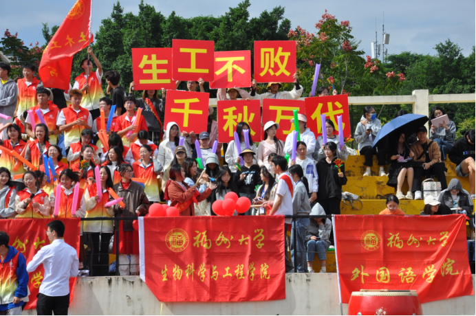 看台上的啦啦队为运动健儿们欢呼鼓舞。“生工不败,千秋万代”,句句加油,阵阵鼓声,都在激励着运动员们奏响生工学院最强音奋进的心,传达着生工学院全体对运动员们最大的鼓励与支持。