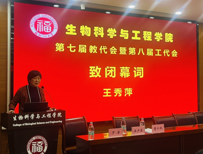 2023年12月28日下午,福州大学生物科学与工程学院第七届教代会暨第八届工代会在生工北楼柏物产厅隆重召开。全院教职工及特邀嘉宾齐聚一堂,共同回顾和总结学院过去五年的工作,并对新的一年学院的工作进行合理展望和部署。校工会程玉敏主席、院党委王秀萍书记、院长汪少芸教授、副院长石贤爱教授、院党委曹仁秋副书记、副院长王航副教授出席会议。