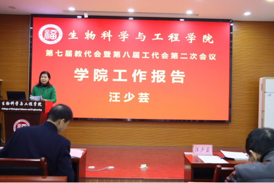 2024年12月26日下午,福州大学生物科学与工程学院第七届教代会暨第八届工代会第二次会议在生工北楼柏物产厅隆重召开。全院教职工齐聚一堂,共同回顾和总结学院2024年的工作,并对新的一年学院的工作进行合理展望和部署。院党委李礼建书记、院长汪少芸教授、副院长石贤爱教授、院党委曹仁秋副书记、副院长王航副教授出席会议。